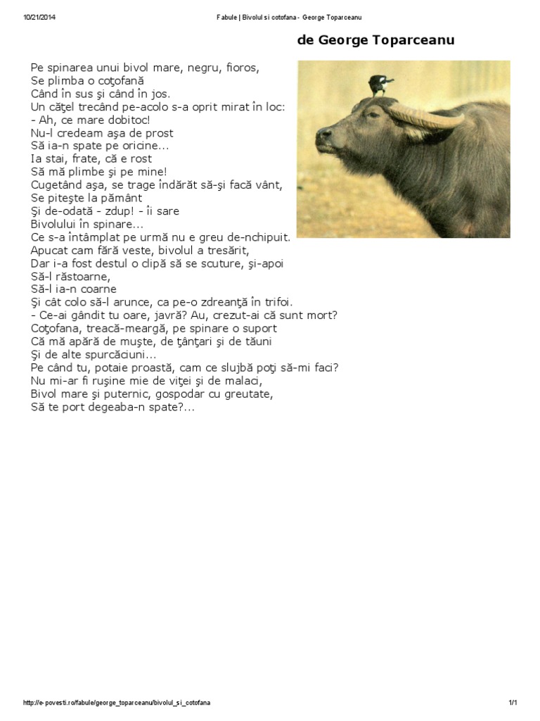 Fabulele sunt menite să aibă un rol educativ moralizator. începe școala primară la bucurești intre anii 1893 1895 și o continuă pe valea topologului la șuici județul argeș unde părinții se. Fabula bivolul si cotofana de george toparceanu va oferim spre lectura fabula pentru copii bivolul si cotofana scrisa de george toparceanu. Ah ce mare dobitoc.