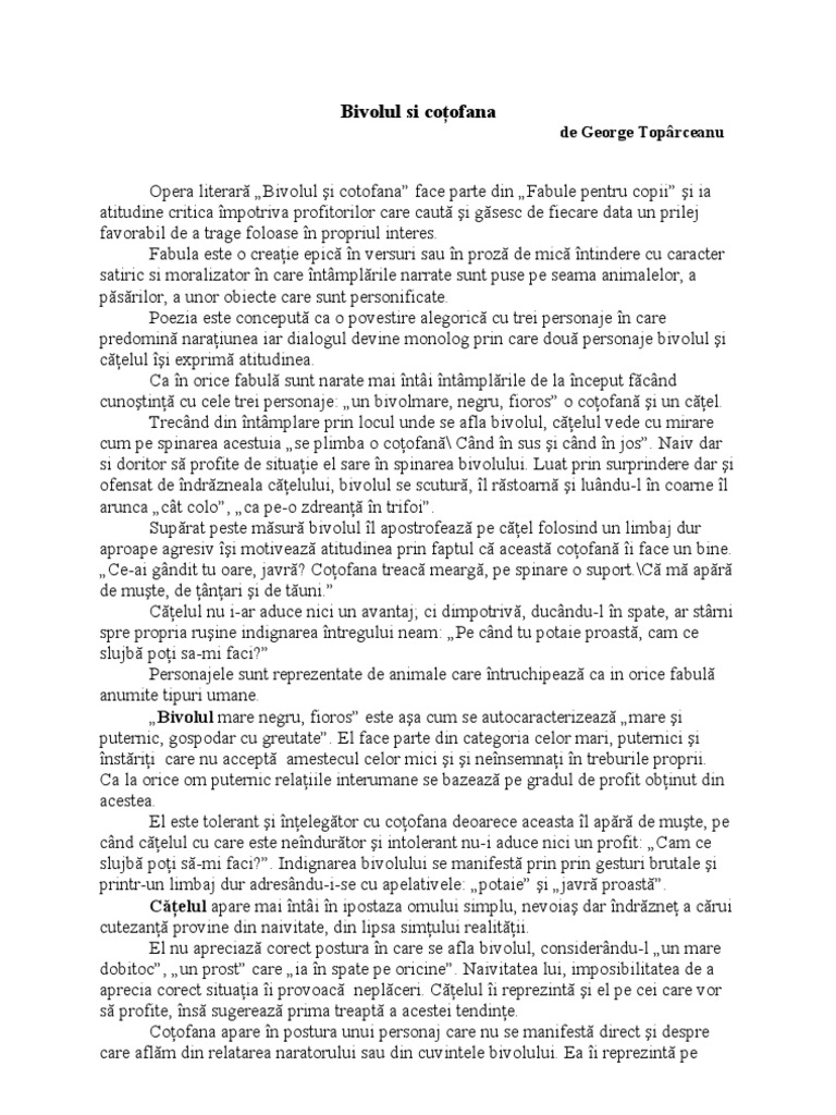 Bivolul si cotofana de george toparceanu referate bivolul si cotofana de george toparceanu un loc aparte in creatia lui george toparceanu il ocupa fabulele acele opere literare epice in care sunt povestite intamplari puse pe seama animalelor a pasarilor si care au caracter satiric si moralizator criticand anumite defecte omenesti.
