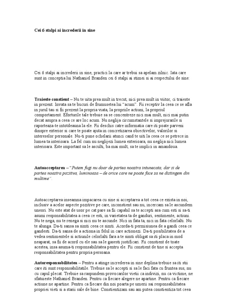 Nathaniel Brandon Cei 6 Stalpi Ai Increderii In Sine Pdf Document