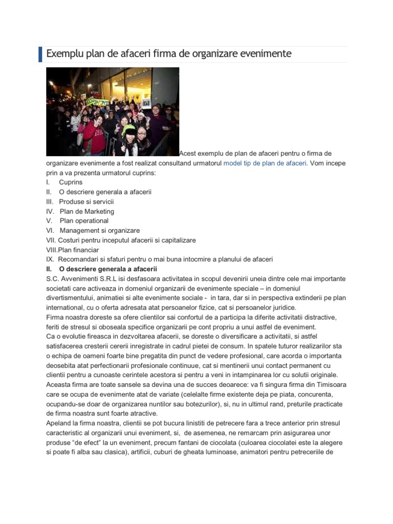 Exemplu Plan De Afaceri Firma De Organizare Evenimente