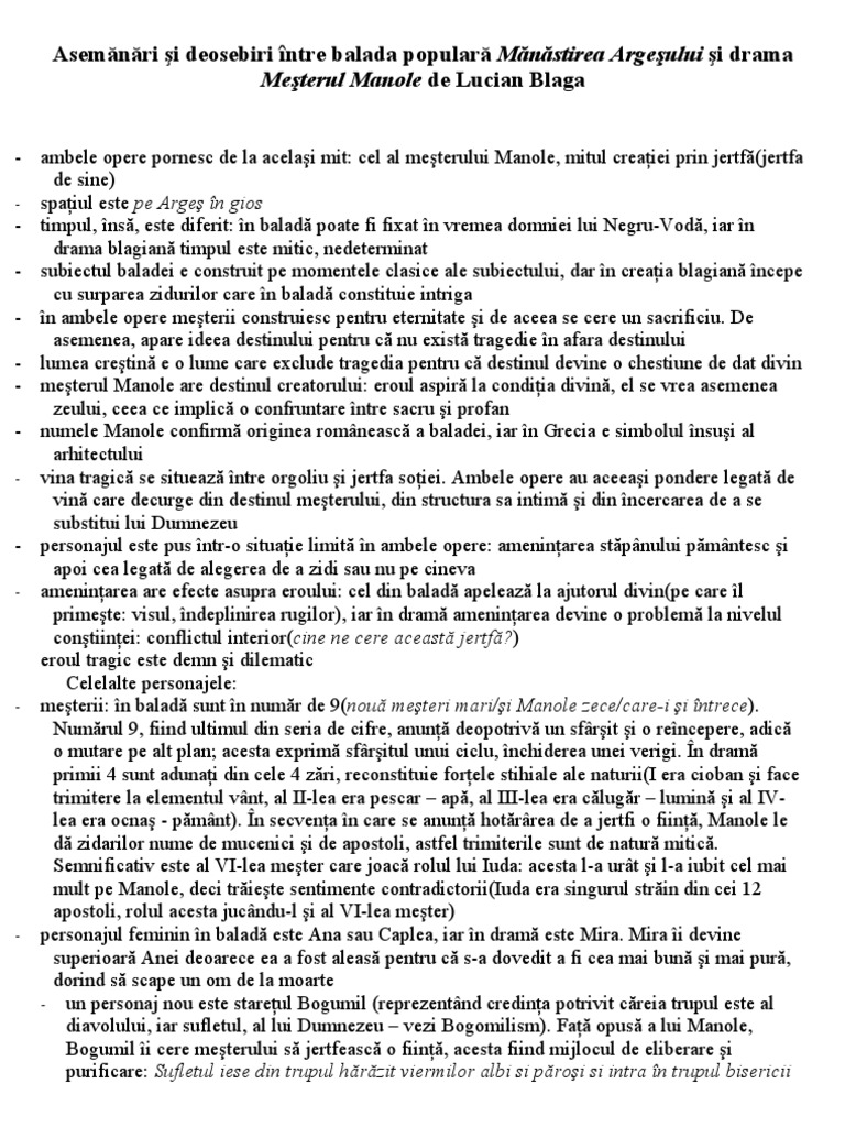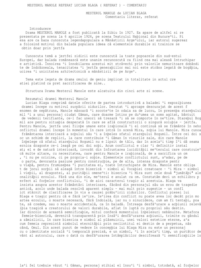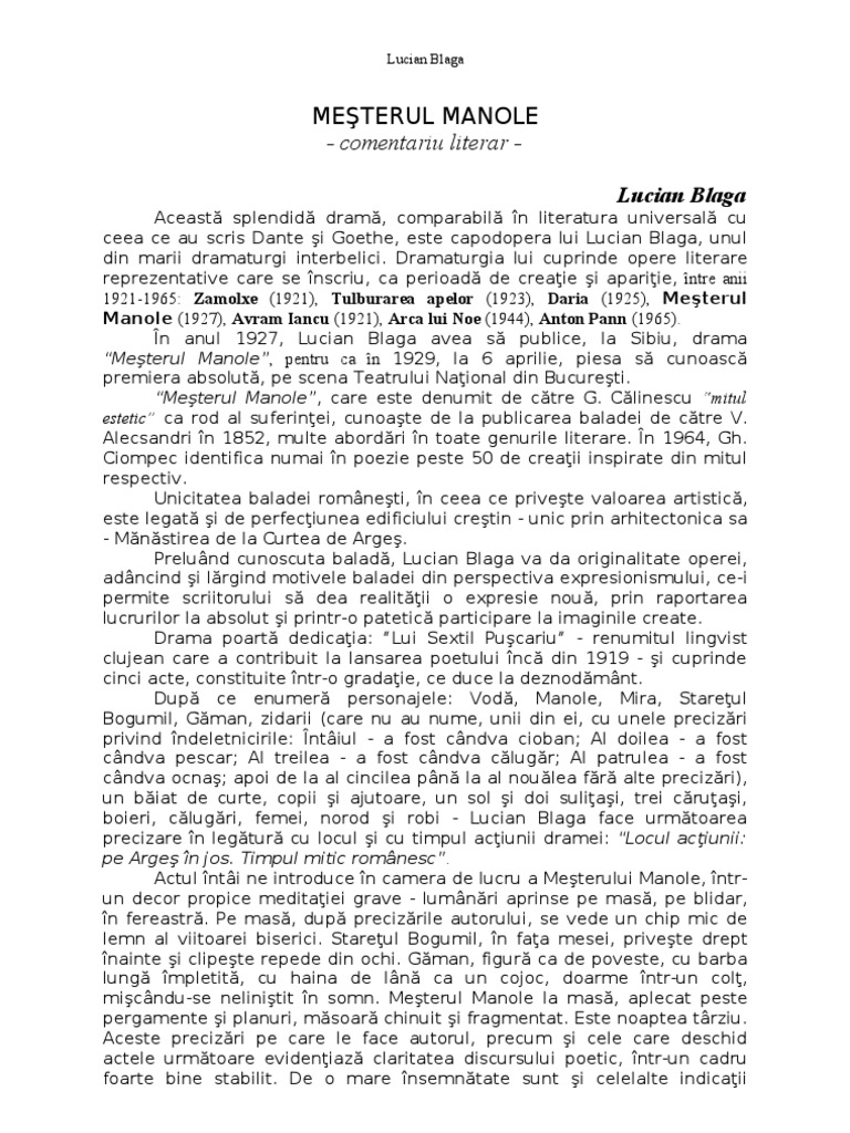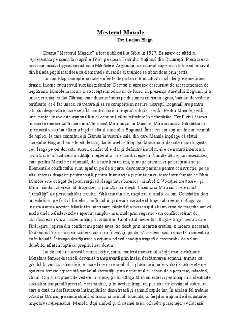 Aceasta splendida drama comparabila in literatura universala cu ceea ce au scris dante si goethe este capodopera lui lucian blaga unul din marii dramaturgi interbelici. în piesa meșterul manole personajele sunt în număr mediu dintre care unele sunt foarte bine individualizate. Drama meşterul manole de lucian blaga 1895 1961 a apărut la sibiu în 1927 iar la 6 aprilie 1929 are loc premiera piesei la teatrul naţional din bucureşti apoi la berna elveţia şi la lwow polonia înscriindu se în literatura modernă interbelică drama lui lucian blaga se inspiră ca atâtea alte creaţii literare din mitul popular al jertfei pentru creaţie pe care însă. Numele ei n a fost ales intimplător de blaga deoarece acesta semnifică pace biruinţă soartă şi chiar zid in care de fapt ea işi găseşte moartea sacrificându se in numele creaţiei pentru soţul ei.