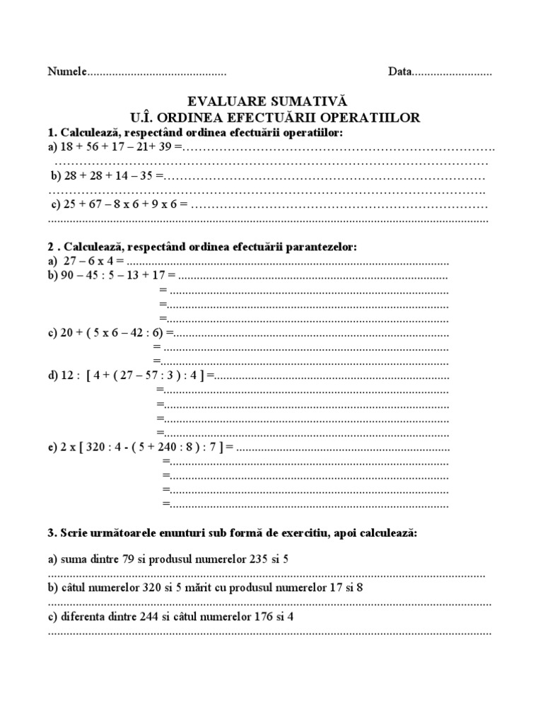 Ordinea Efectuării Operațiilor Fișă De Lucru Cu Posibilitate De