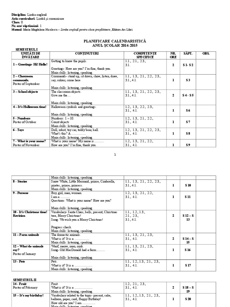 Planificare Calendaristica Maria Magdalena Nicolescu Limba Engleză Pentru Clasa Pregătitoare Christmas