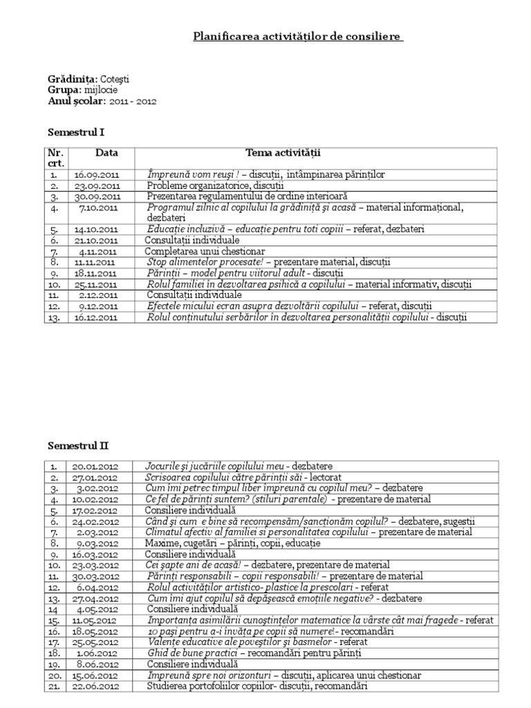 Tematica activităţilor de consiliere a părinţilor grupa mică an şcolar 2016 2017 nr crt. 12 09 16 09 2016 bun venit la grădiniţă. Planificarea activităților de consiliere a părinților copiilor grupei mari albinuțele an școlar 2016 2017 educatoare. Planificarea activitatilor de consiliere a parintilor an scolar 2018 2019.