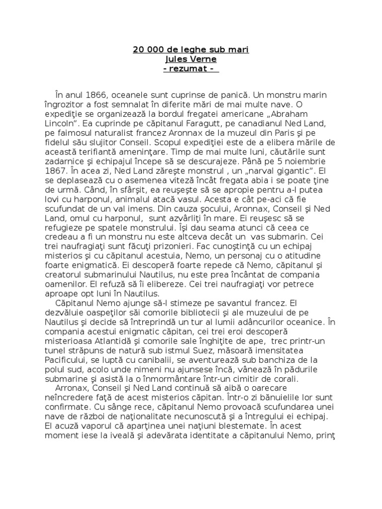 20 000 De Leghe Sub Mari Jules Verne Rezumat