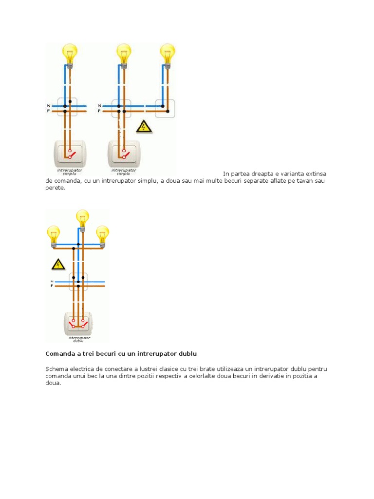 Faza care vine de la siguranta se conecteaza la intrarea de la intrerupator iar la cele doua iesiri se conecteaza doua cabluri de faza ce merge. Schema unui circuit electric simplu cu intrerupator dublu ce actioneaza aprinderea a doua becuri separate. Schema electrica de conectare a lustrei clasice cu trei brate utilizeaza un intrerupator dublu 2xspst pt. Pentru a lega un intrerupator dublu trebui sa conectezi null ul de la siguranta direct cu cele doua becuri sau dispozitive de iluminat controlate separat la fel si impamantarea daca este prezenta.