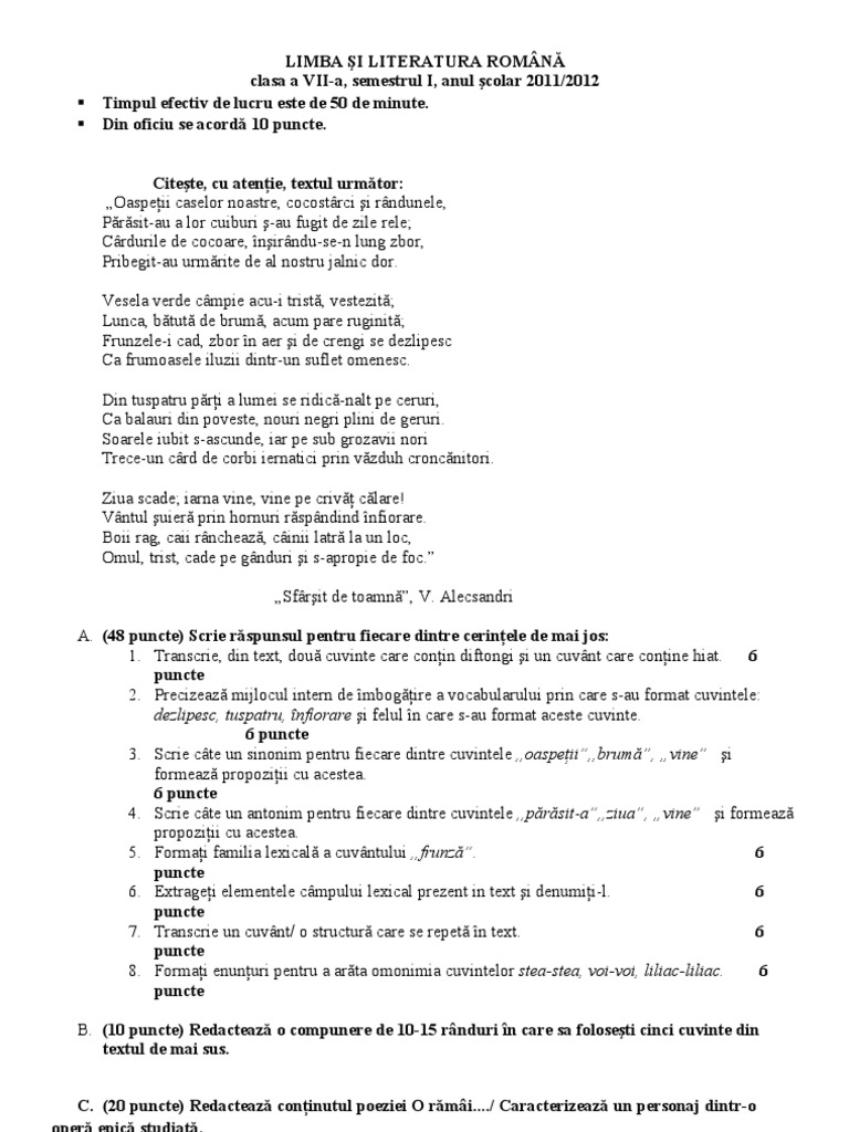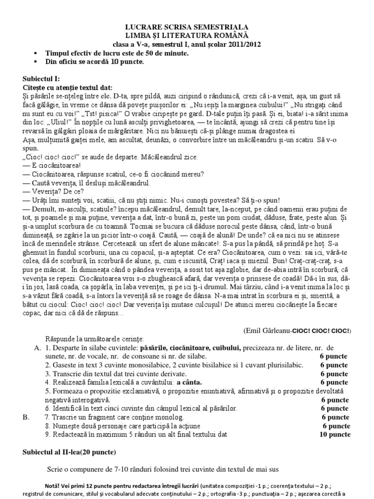 Teză Pe Semestrul I La Limba Si Literatura Romană Clasa A5a