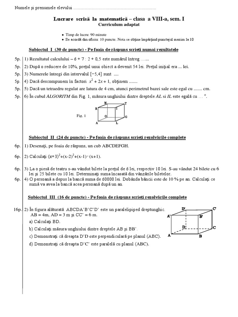 Lucrare Scrisă La Matematică Clasa A Viii A Semestrul I 2017 2018 Dana Bumbea
